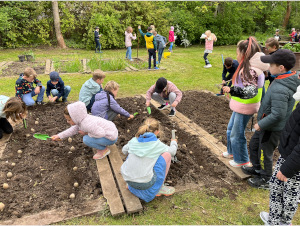 Heute begann für die Klassen das Projekt „Kids an die Knolle“. Durch die tolle Vorarbeit von Frau Pfeil mit ihrer 3b, die die Beete umgegraben und von Unkraut befreit haben, konnte die 2a das schöne Wetter heute endlich nutzen. Mit Hilfe von verschiedenen Werkzeugen wurden tiefe Furchen gezogen und neue Kartoffeln gesetzt. Nun heißt es warten, anhäufeln und auf eine reiche Ernte im Herbst hoffen.